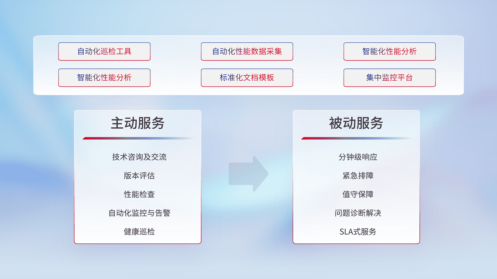 智能化工具和标准化文档,,,,保障服务质量,,,提供主动服务(包含技术咨询、、、版本评估、、、性能检查、、自动化监控与告警、、、、健康巡检)和被动服务包含(分钟级响应、、、、紧急排障、、、、值守保障、、、、问题诊断解决、、、SLA服务)。。。