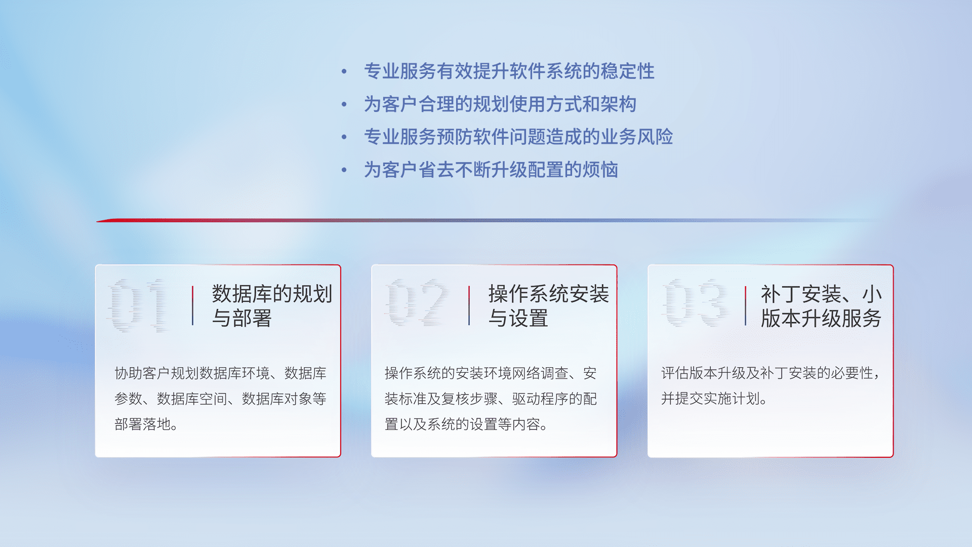 为客户提供软件规模升级、、、快速部署、、、按需配置的专业服务,,,,从数据库的规划与部署到操作系统的安装与设置,,,,再到补丁安装和小版本升级提供支持。。。。
